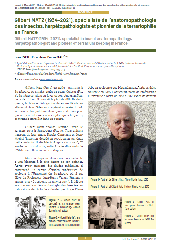 Gilbert MATZ (1934-2021), spécialiste de l’anatomopathologie des insectes, herpétopathologiste et pionnier de la terrariophilie en France. Ineich & Macé, 2025